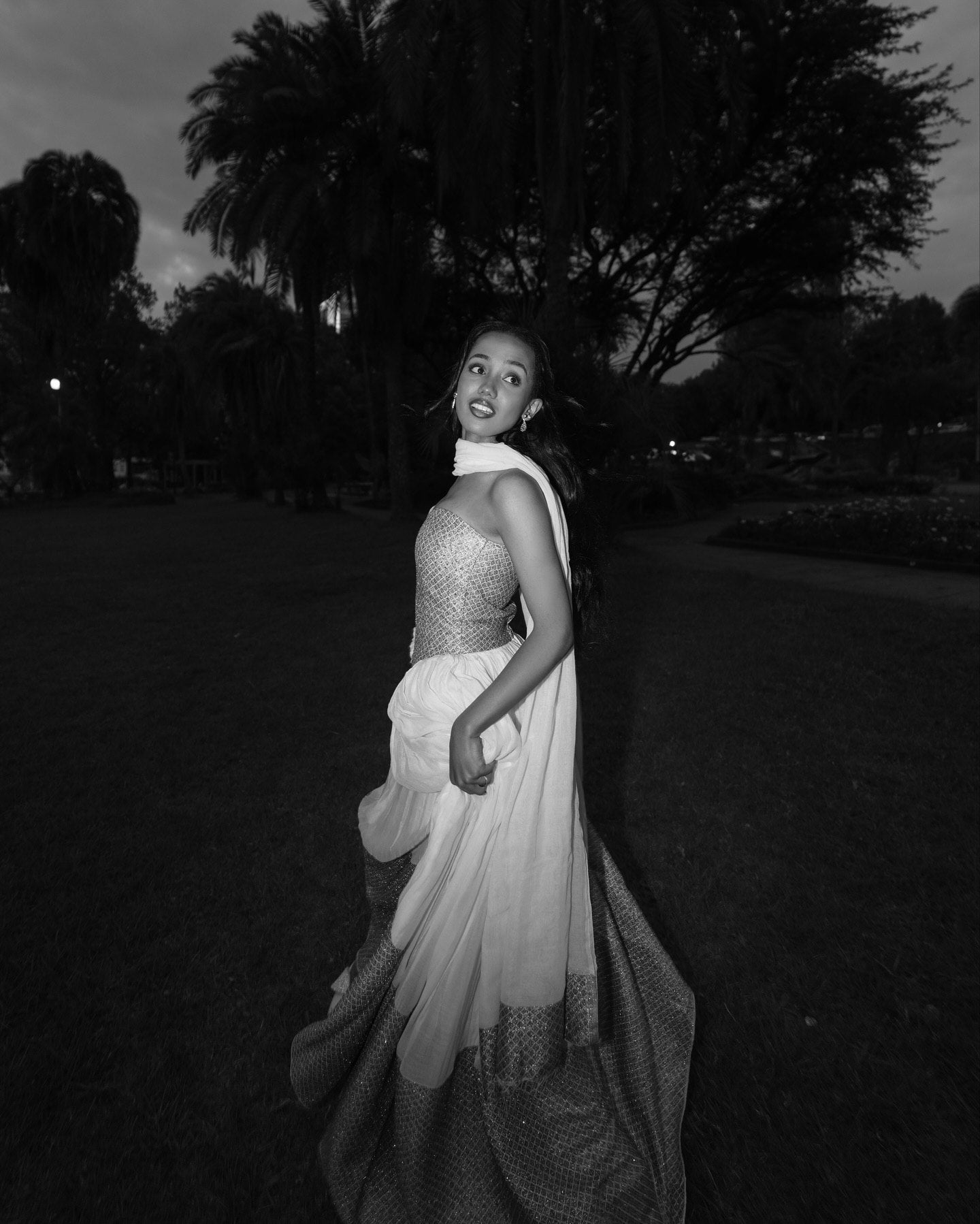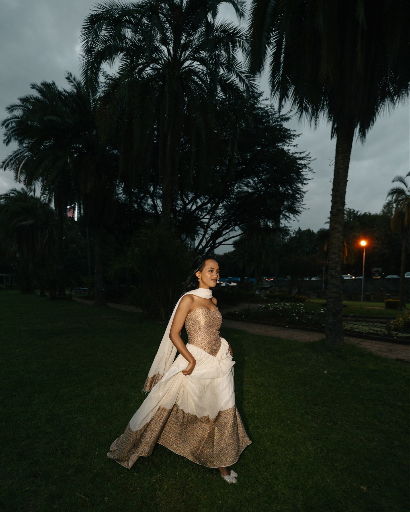 Captured in the soft evening light, the couple’s attire stands out against the lush outdoor setting, evoking a sense of romance and heritage. This image beautifully celebrates modern Ethiopian style, cultural pride, and the art of couple styling that honors tradition while embracing modern elegance.