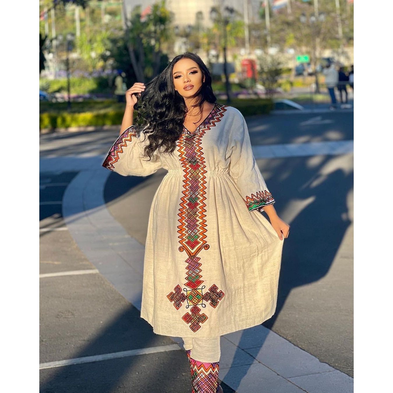 This fashionable Fetil Habesha dress is the perfect combination of traditional and modern style. The Shimena cut flatters your curves and adds a touch of elegance to the design, while the intricate Fetil embroidery on the neckline and sleeves is a true work of art, showcasing the skill and craftsmanship of Ethiopian artisans.