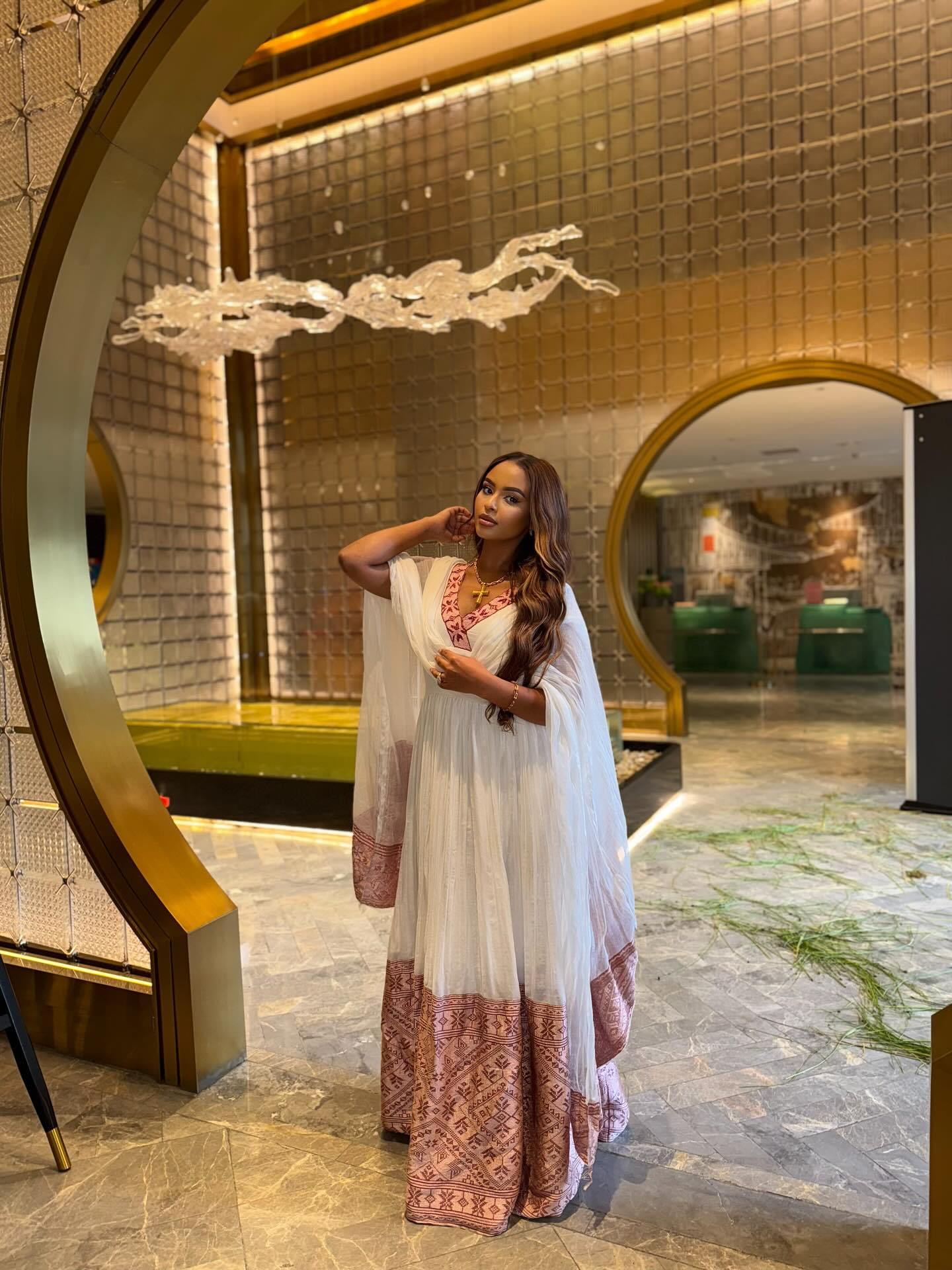 This exquisite Habesha Kemis beautifully blends timeless tradition with modern sophistication. The flowing white fabric paired with soft rose-gold patterned borders highlights the delicate artistry found in Ethiopian dress craftsmanship. Designed to flatter with graceful draping and a serene color palette, this piece reflects true cultural elegance.