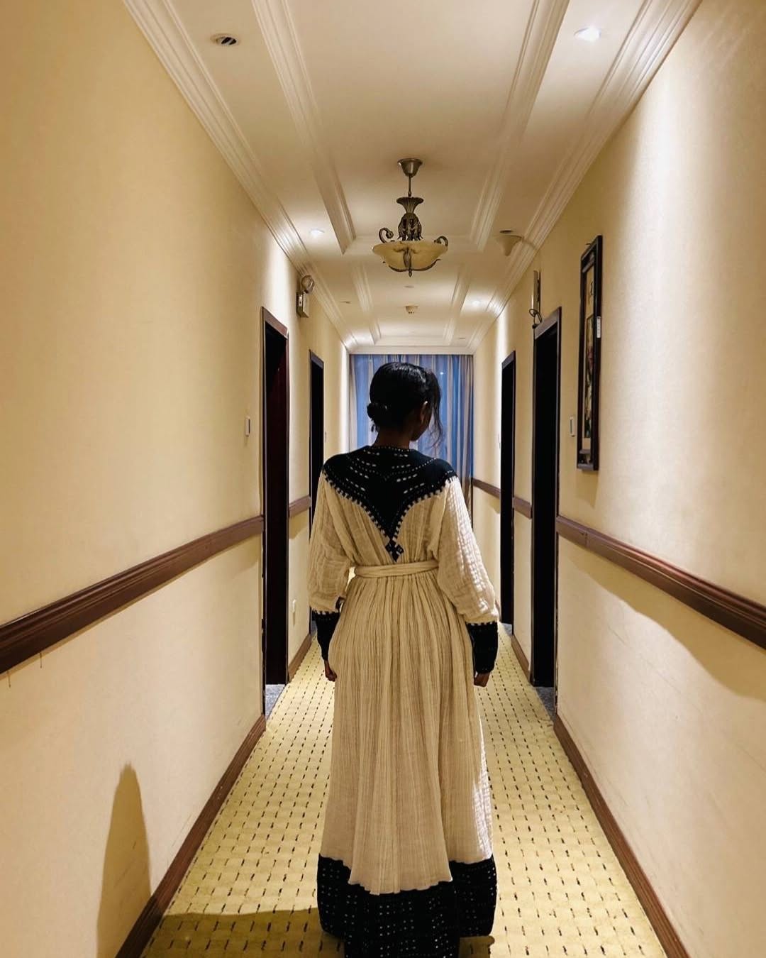 Designed for elegance and comfort, this traditional Ethiopian dress flows beautifully with every movement. Its intricate geometric embroidery symbolizes unity, creativity, and pride in Ethiopian artistry. The natural cotton texture ensures breathability, while the full-length design creates a refined silhouette suitable for any formal or festive setting.