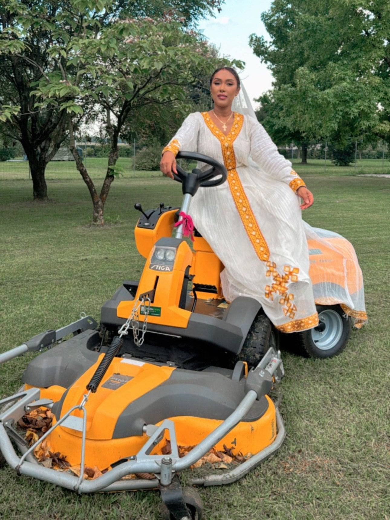Crafted using traditional techniques inspired by habesha cloth, the detailed cross design is carefully integrated into the bodice and decorative panels. These symbolic patterns are also commonly found in classic Eritrean dress, representing faith, identity, and cultural continuity across generations.