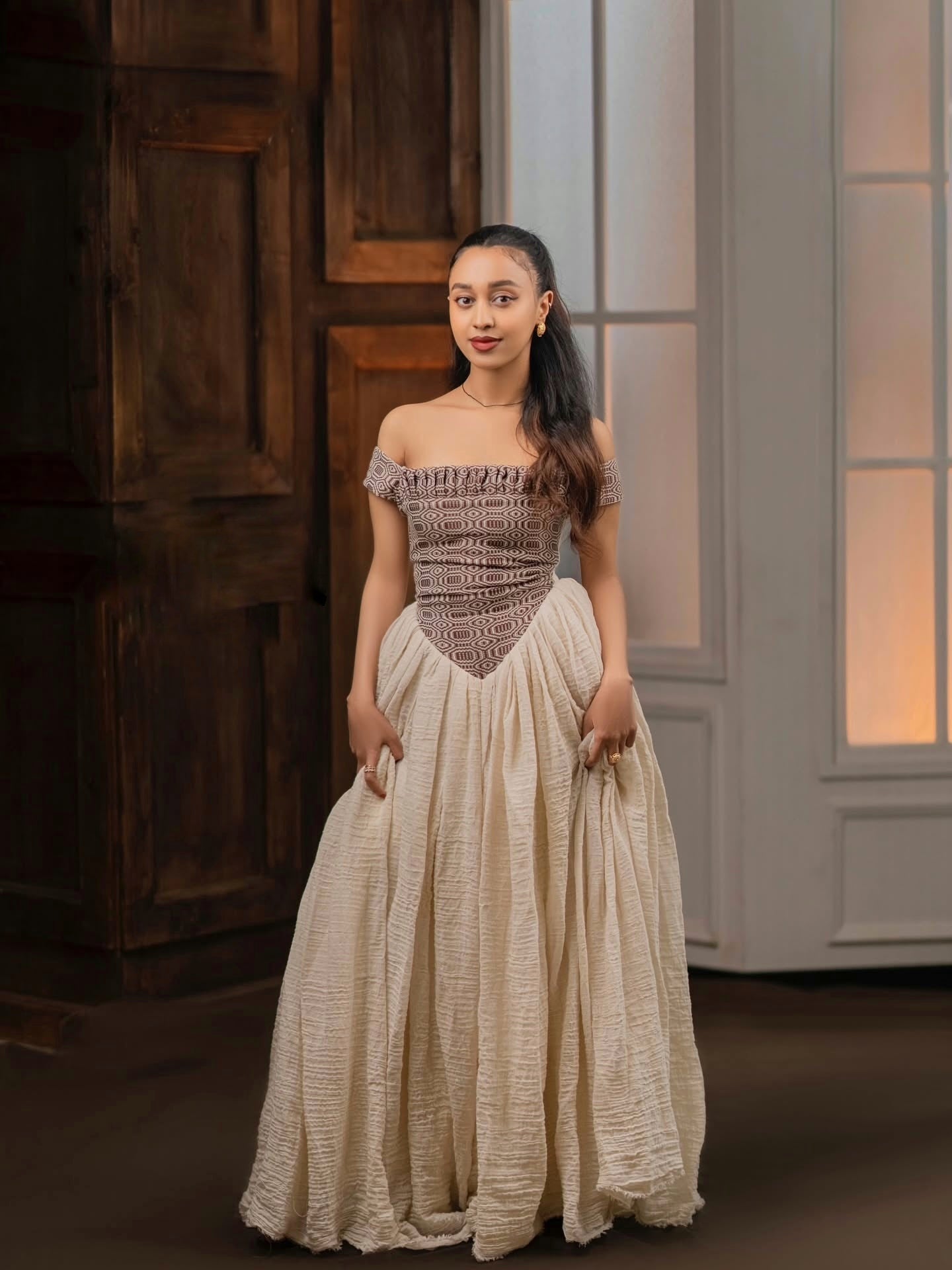 Inspired by the timeless beauty of Traditional Ethiopian dress, this outfit showcases delicate craftsmanship and unique embroidery that reflects the essence of Ethiopian heritage. The off-shoulder cut adds a sophisticated modern touch, offering a balance between contemporary fashion and cultural authenticity. Each detail speaks of artistry and identity, connecting the past and present beautifully.