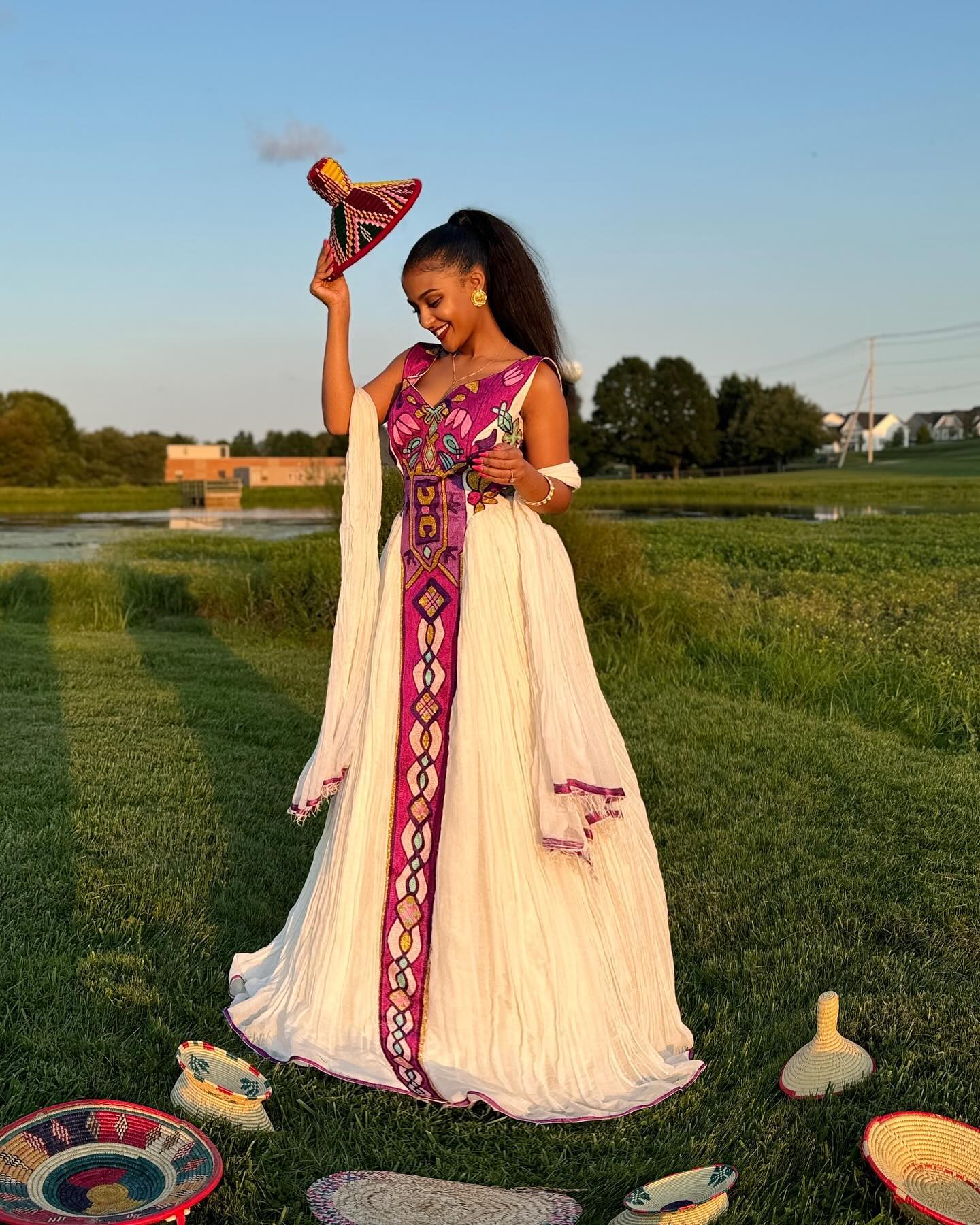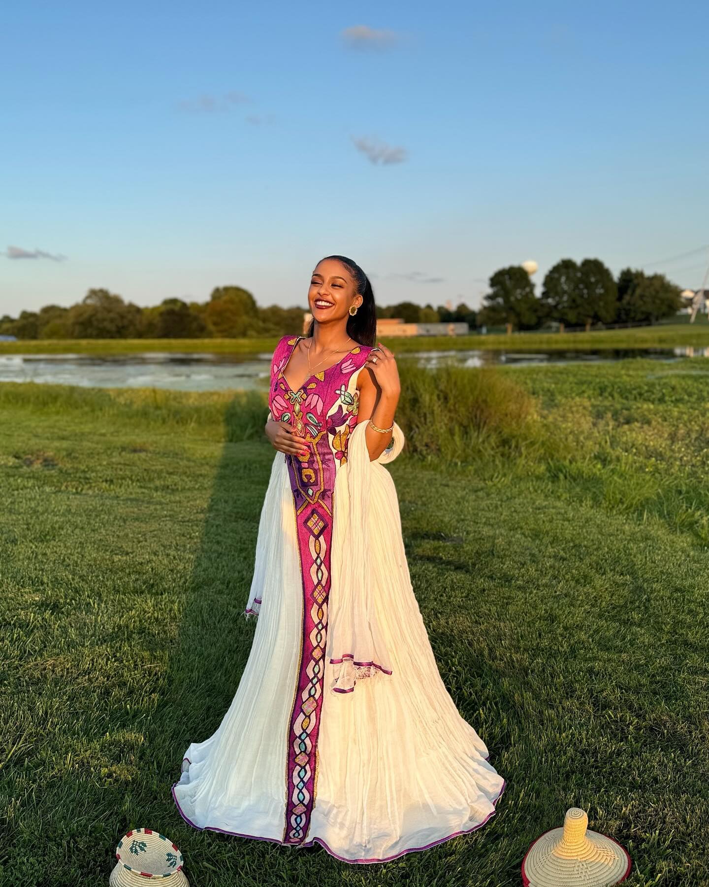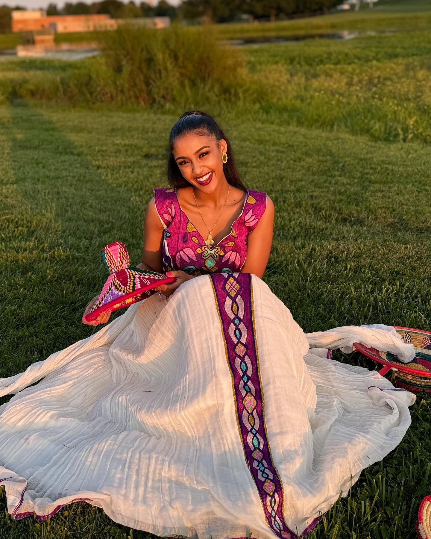 This dress is a modern take on the traditional Habesha kemis, combining elegance with a touch of contemporary design. It features a marvelous Tilef design with bold and lively colors, which gives the dress a graceful and ethereal look. It is perfect for any age group and events.