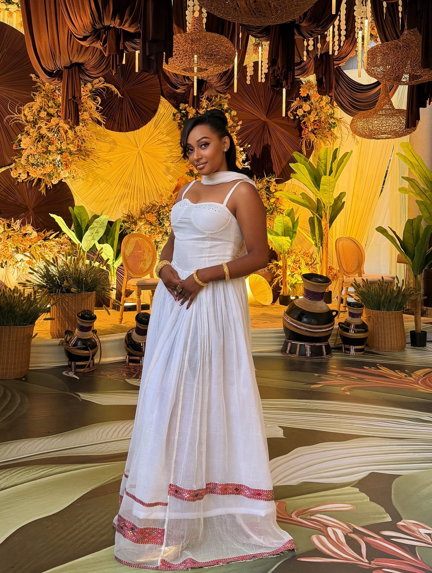Crafted from authentic habesha cloth, the piece features subtle red embroidery inspired by classic Eritrean dress traditions. The minimalist structure highlights the artistry and balance found in Traditional Ethiopian dress.