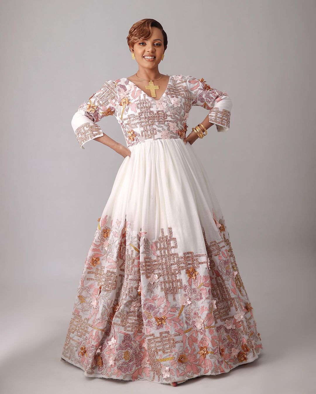 Embrace the beauty of nature with this modern Ethiopian Habesha wedding dress, adorned with sparkling flower-like designs. Its intricate embroidery and shimmering embellishments create a captivating and enchanting look. Perfect for your special day, this dress is a celebration of Ethiopian artistry and will make you feel like a blooming flower on your wedding day.