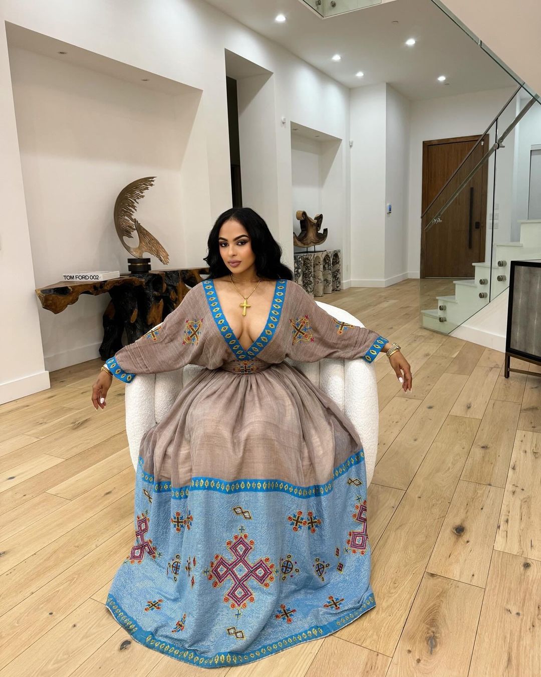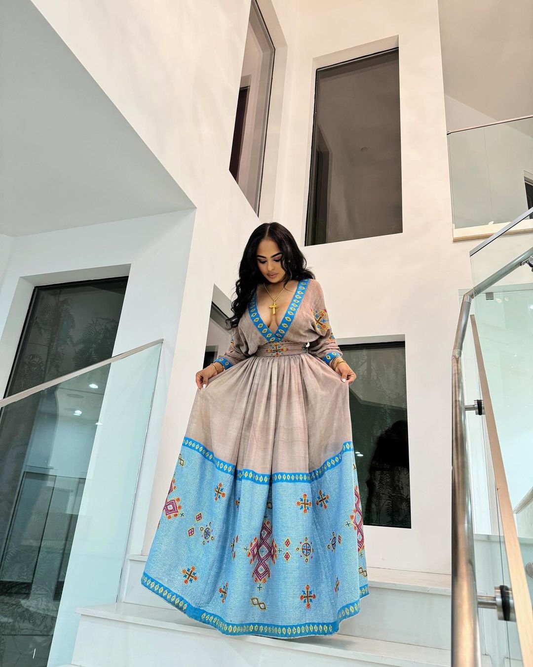Stylish Modern Ethiopian Dress with Blue Wide Tilet Design Ethiopian Traditional Dress