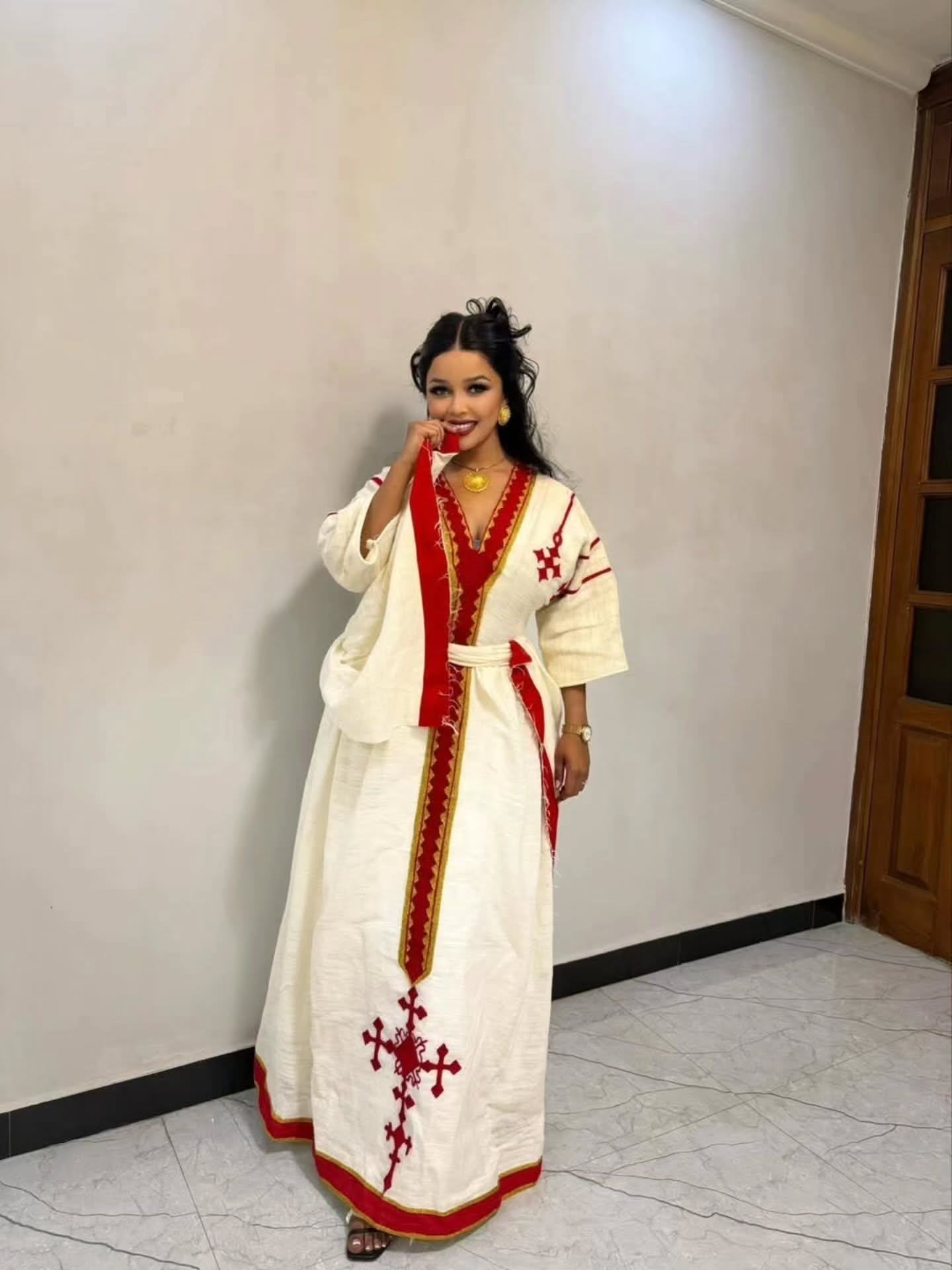 The overall silhouette honors the legacy of Traditional Ethiopian dress, while the intricate red woven accents highlight the identity of Traditional Ethiopian clothing. Designed as a red woven Habesha dress, this piece stands as a meaningful expression of tradition, elegance, and cultural pride.