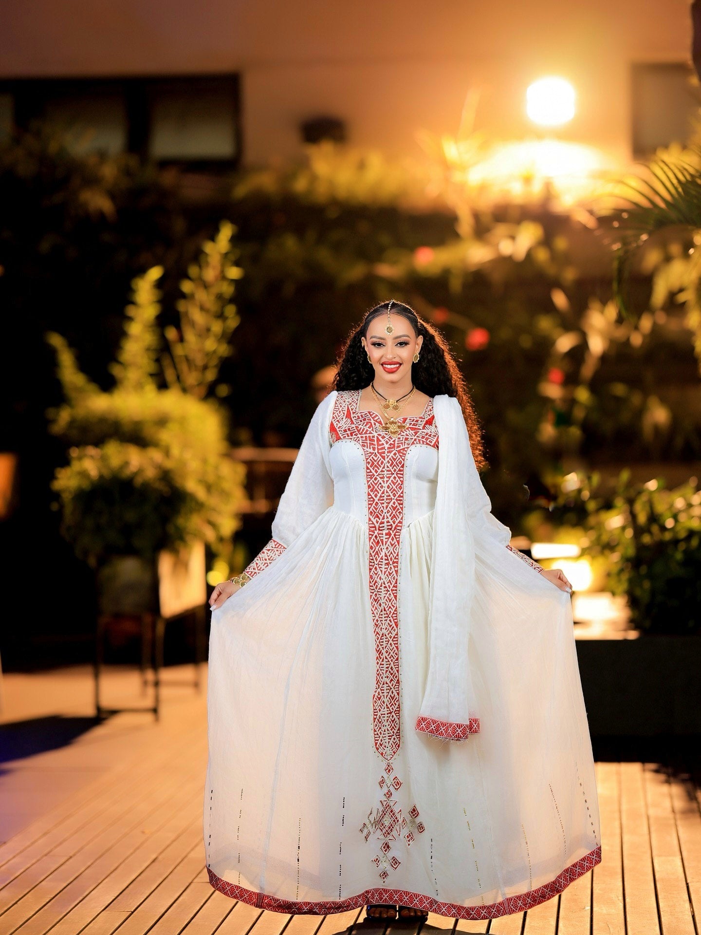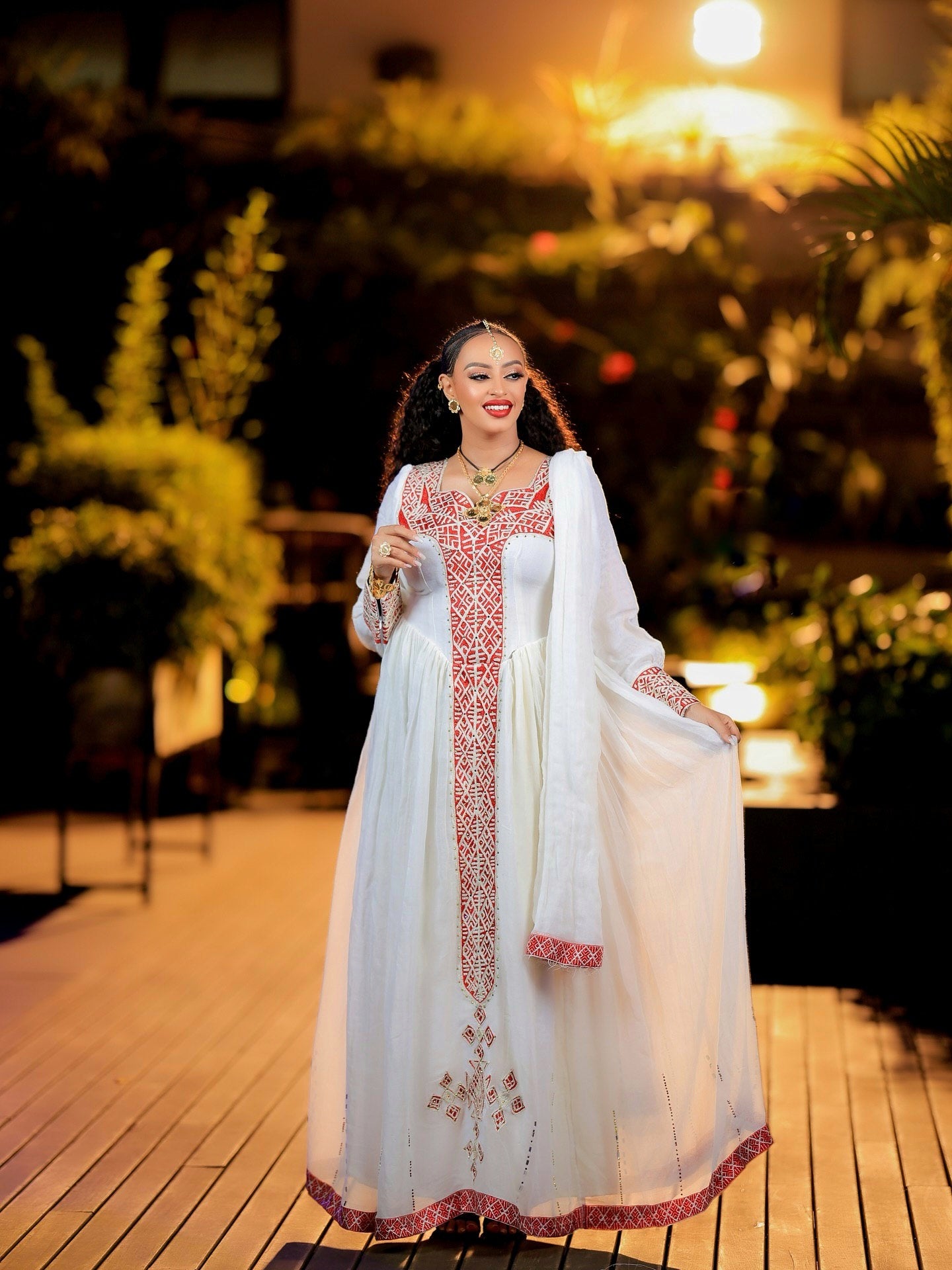 This stunning image beautifully showcases the timeless elegance of Traditional Ethiopian clothing, highlighting a graceful woman wearing a radiant Habesha kemis crafted from authentic habesha cloth. The flowing white fabric, accentuated with deep red tibeb embroidery along the neckline, cuffs, and hem, reflects the cultural artistry and heritage of Ethiopia. Every stitch tells a story of tradition, pride, and identity passed down through generations.