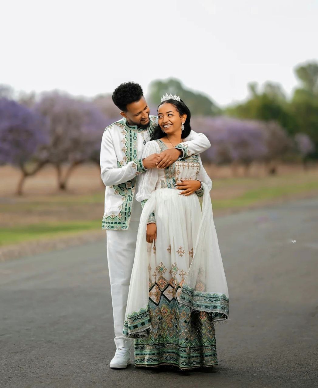 This stunning couples outfit captures the essence of Ethiopian love and tradition, featuring matching designs made from authentic habesha cloth. The bride’s elegant gown is adorned with intricate green and gold embroidery, while the groom’s attire complements hers with coordinated patterns on a classic white ensemble. This beautifully matched look reflects the deep cultural unity celebrated in every Traditional Ethiopian Wedding dress.
