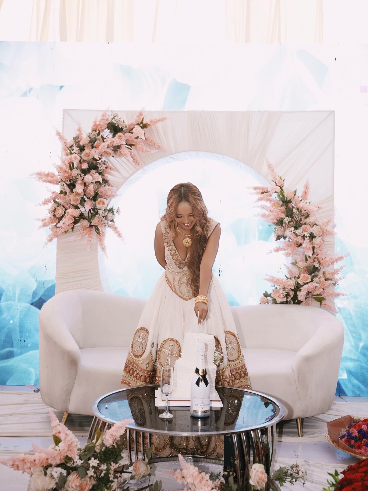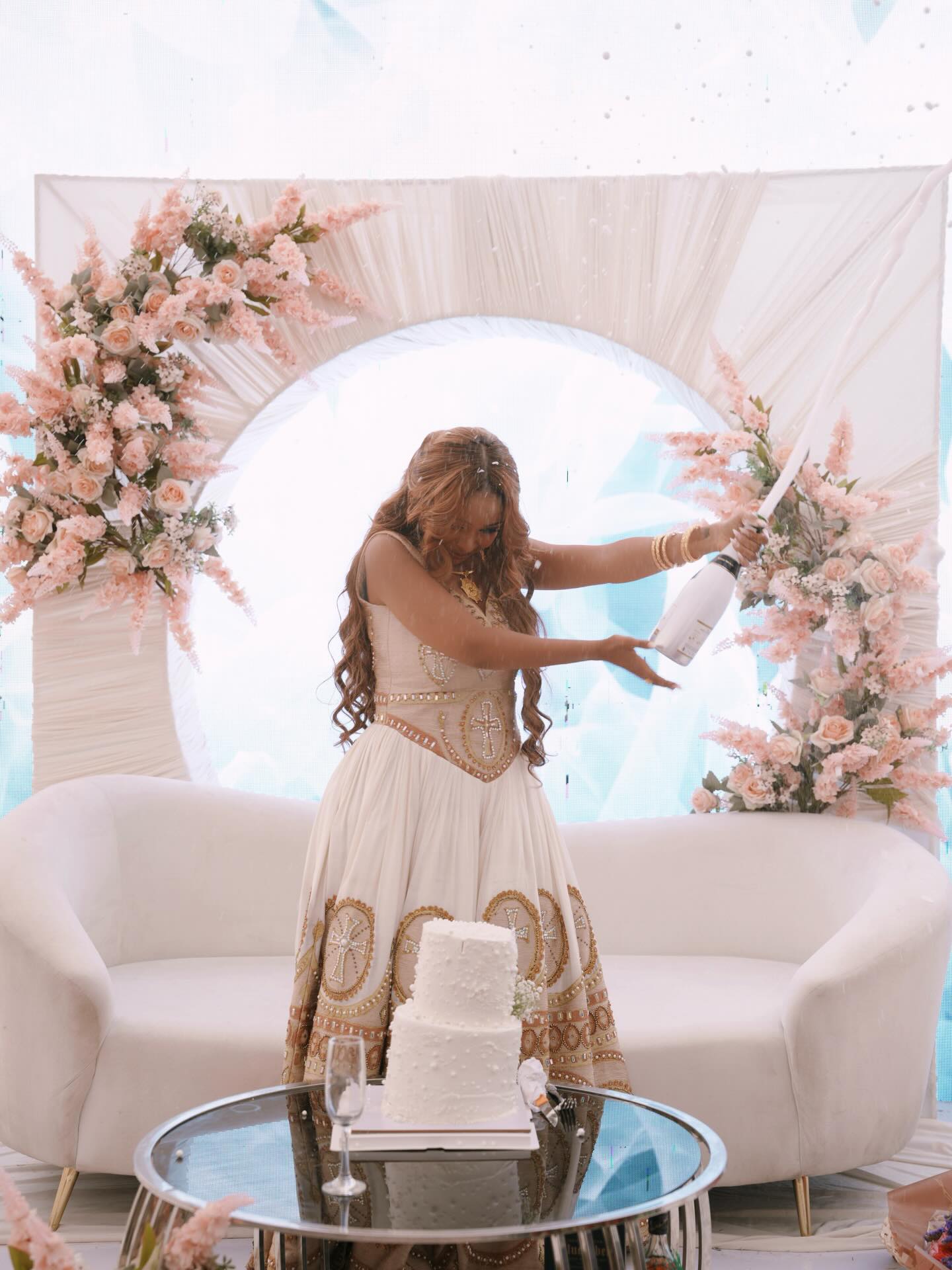 This sleeveless Habesha dress showcases the beauty of Traditional Ethiopian wedding dress with its graceful silhouette and luxurious golden embroidery. Designed with intricate cross patterns and detailed beadwork, the dress reflects the richness and symbolism found in Ethiopian wedding dress traditions.