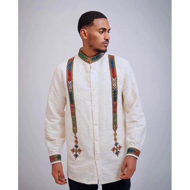 This Habesha shirt is complemented by carefully selected accessories, such as a matching headscarf and jewelry, which enhance its overall beauty and elegance. Wearing this shirt is not only a celebration of Ethiopian culture and tradition but also a statement of style and sophistication.