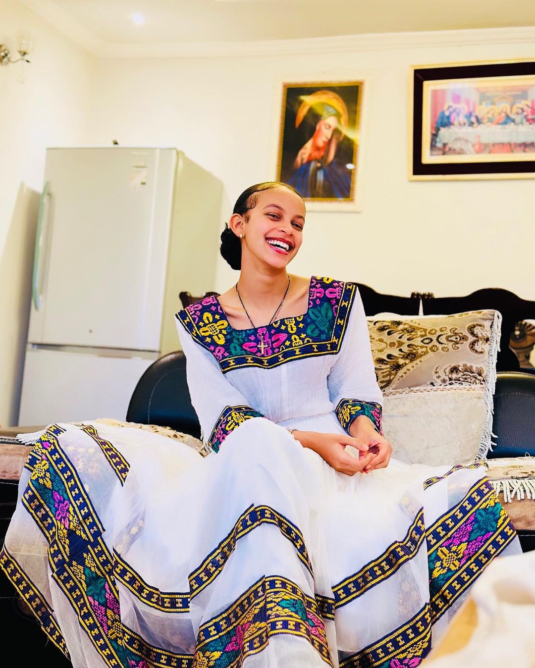 Immerse yourself in the vibrant beauty of this modern Ethiopian Habesha dress, adorned with an exquisite array of colors and patterns. Intricate embroidery and beadwork create a captivating visual masterpiece, paying homage to Ethiopia's rich cultural heritage. Perfect for special occasions or as a statement piece, this dress is a true celebration of Ethiopian artistry.