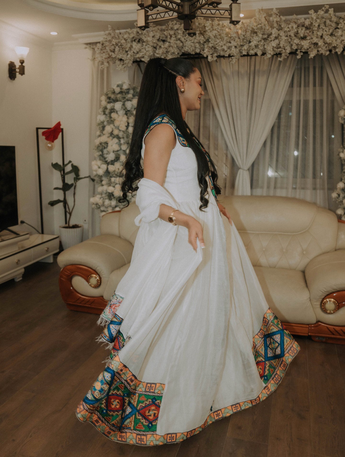 This elegant white Habesha traditional dress showcases a flowing silhouette accented with rich, colorful embroidery inspired by heritage motifs. Designed for cultural ceremonies and special occasions, it reflects the beauty of a classic Ethiopian dress that blends tradition with graceful modern presentation.