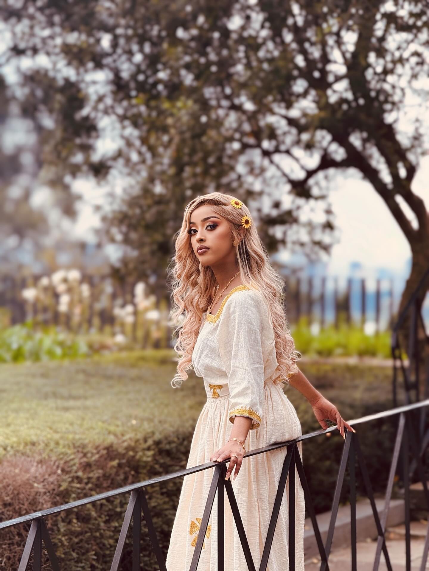 This stunning white dress brings together timeless cultural beauty and soft modern elegance. Crafted from premium habesha cloth, the fabric has a naturally textured, airy feel that moves gracefully with every step. The dress features a flowing A-line silhouette with a gathered waist and gently draped sleeves, creating a look that feels both classic and refined.